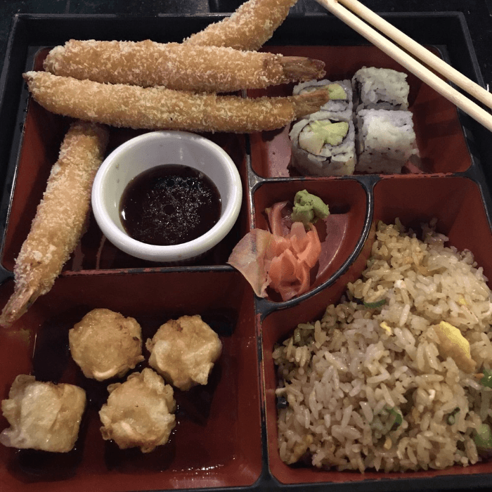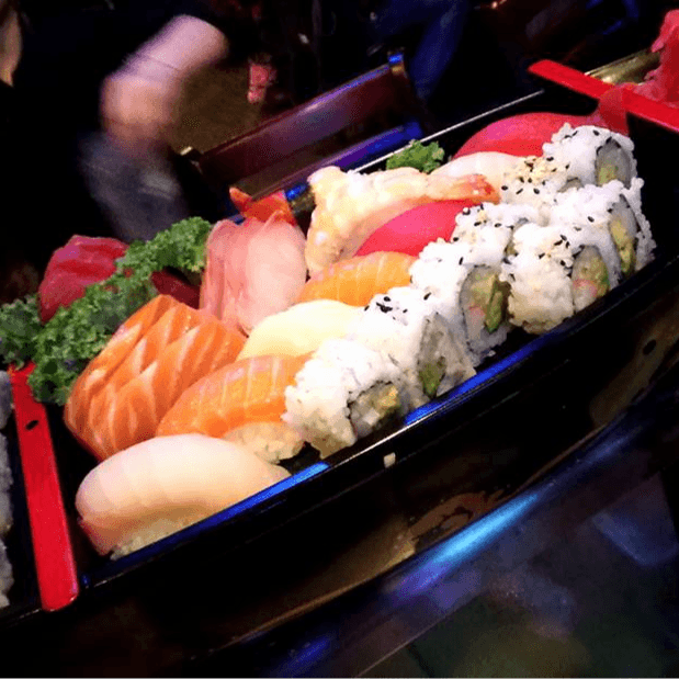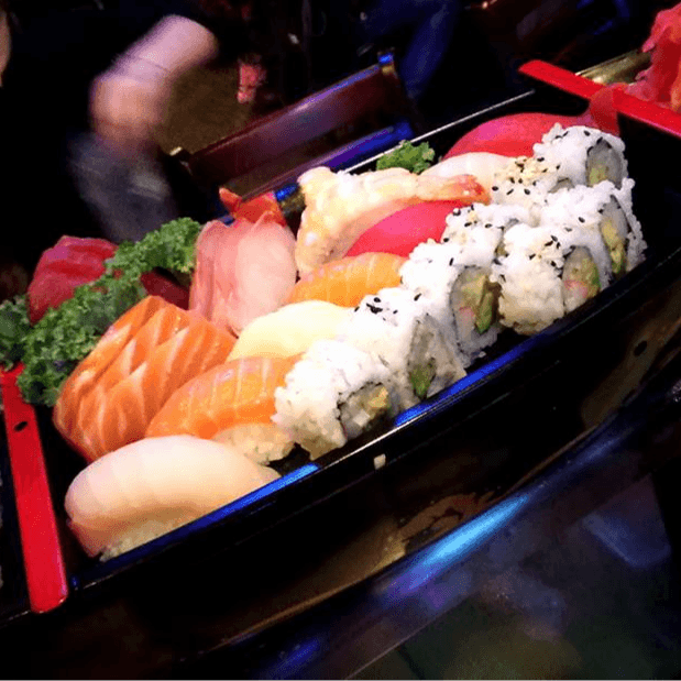 16 sushi, 18 sashimi, shrimp tempura roll, rainbow roll, and spicy tuna roll