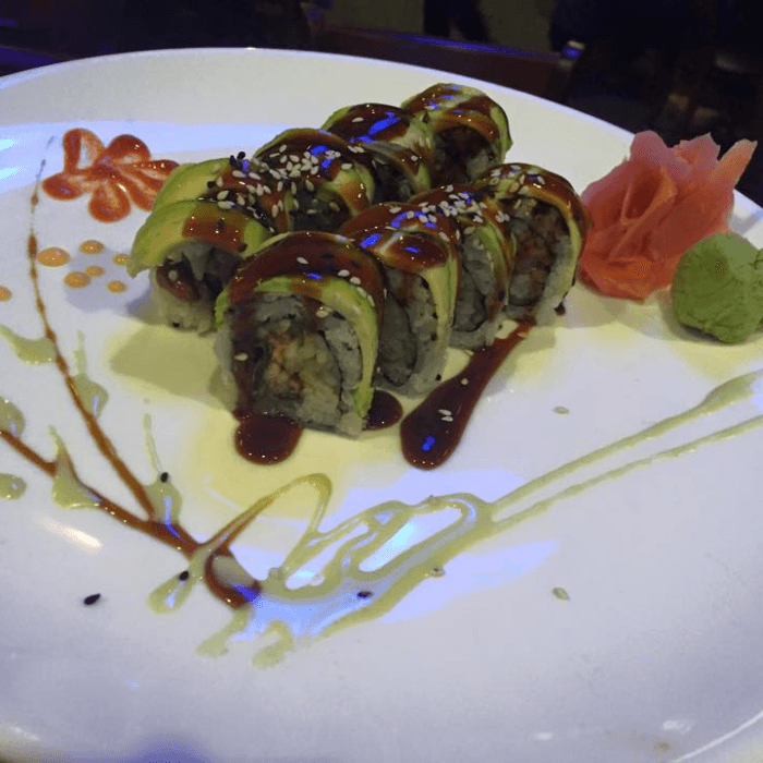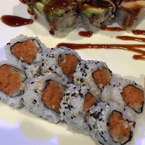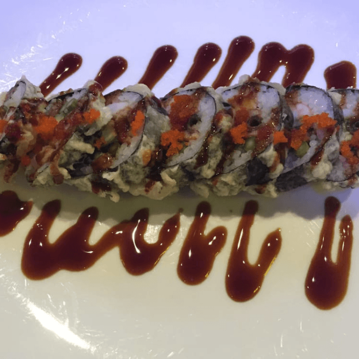 Spicy tuna, avocado, topped yellowtail, tempura crunch, tobiko, scallion, spicy mayo and eel sauce