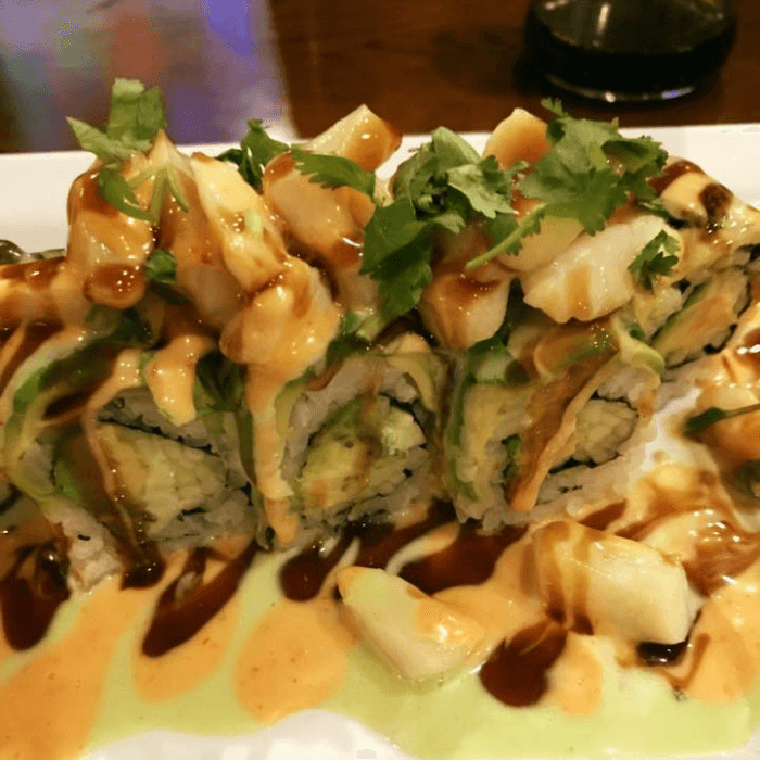 Spicy scallop, avocado, topped tuna, salmon, jalapeno, tempura crunch, scallion, and wasabi sauce