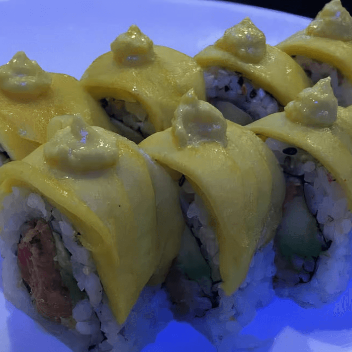 Shrimp tempura, cucumber, avocado, topped with thinly sliced mango and mango sauce