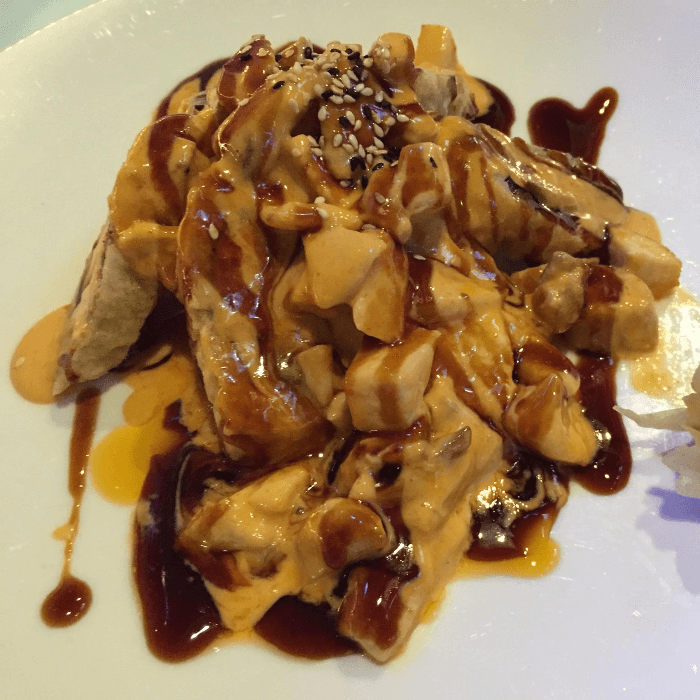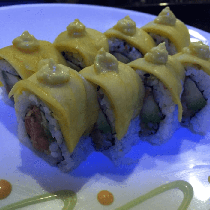 Spicy tuna, avocado, and tempura crunch, topped with thinly sliced mango & mango sauce