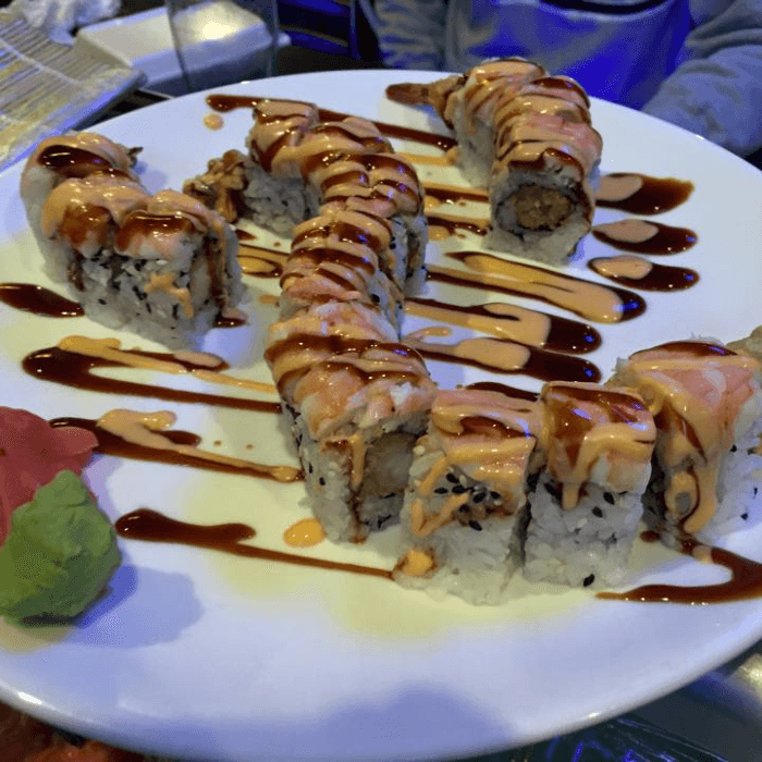 Shrimp tempura, avocado, and crab meat, topped yellowtail, jalapeño, spicy mayo, eel, and sriracha