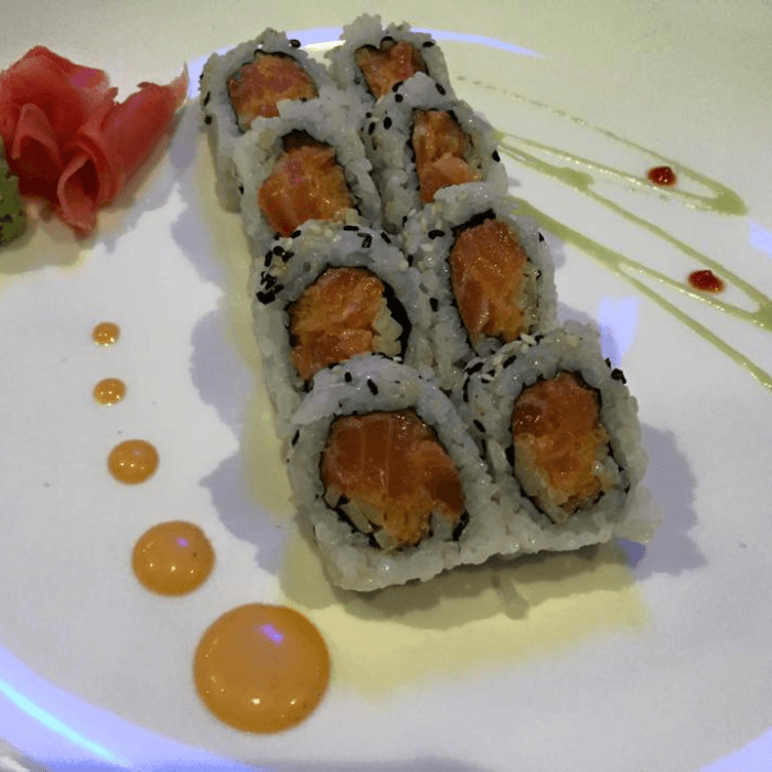 Spicy crabmeat and avocado center, topped salmon lightly torched, spicy mayo & spring mix
