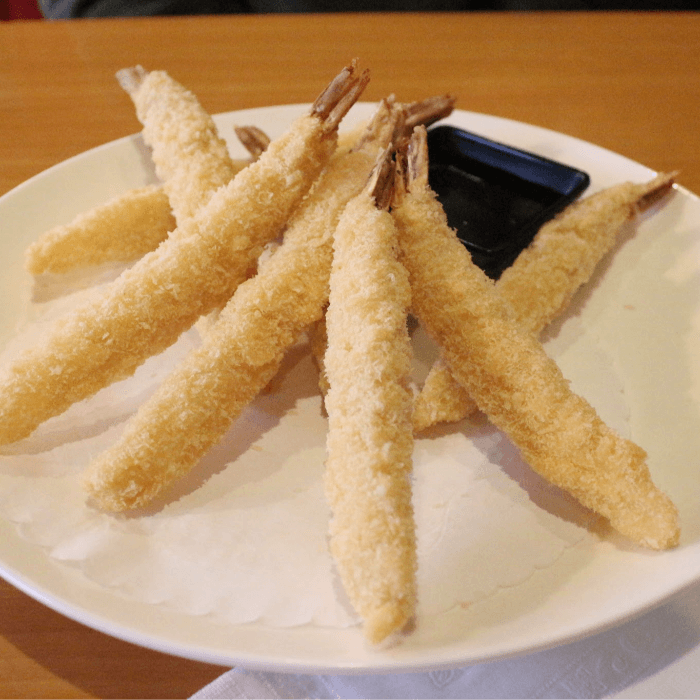 Shrimp tempura, topped with eel, avocado, and fish roe